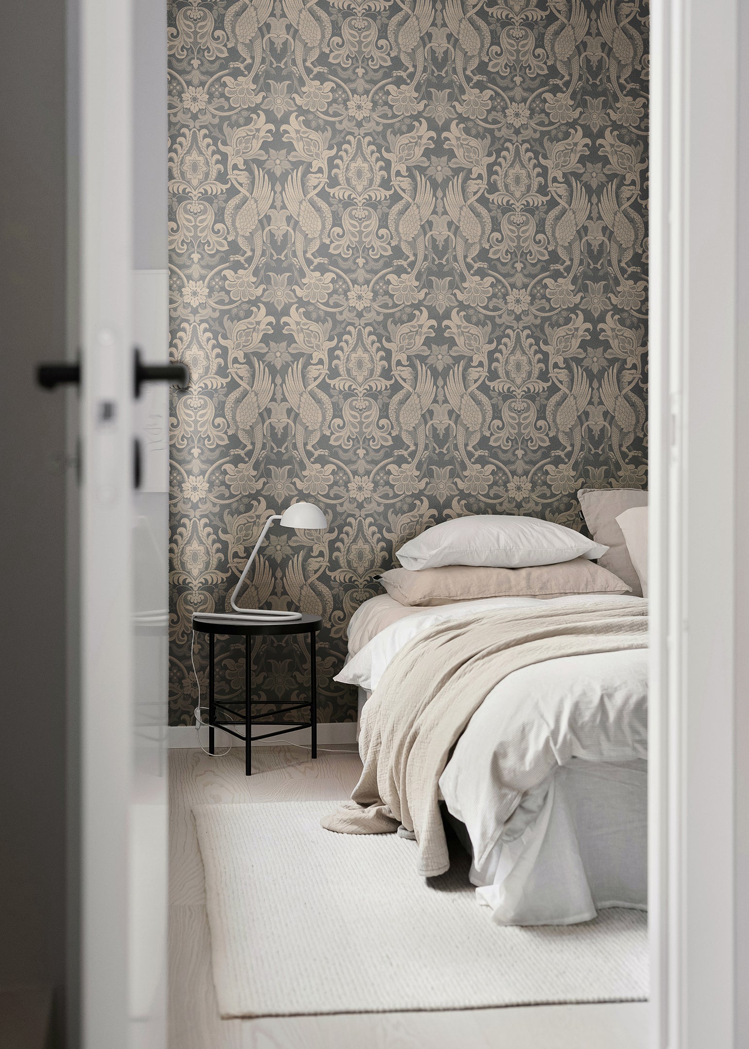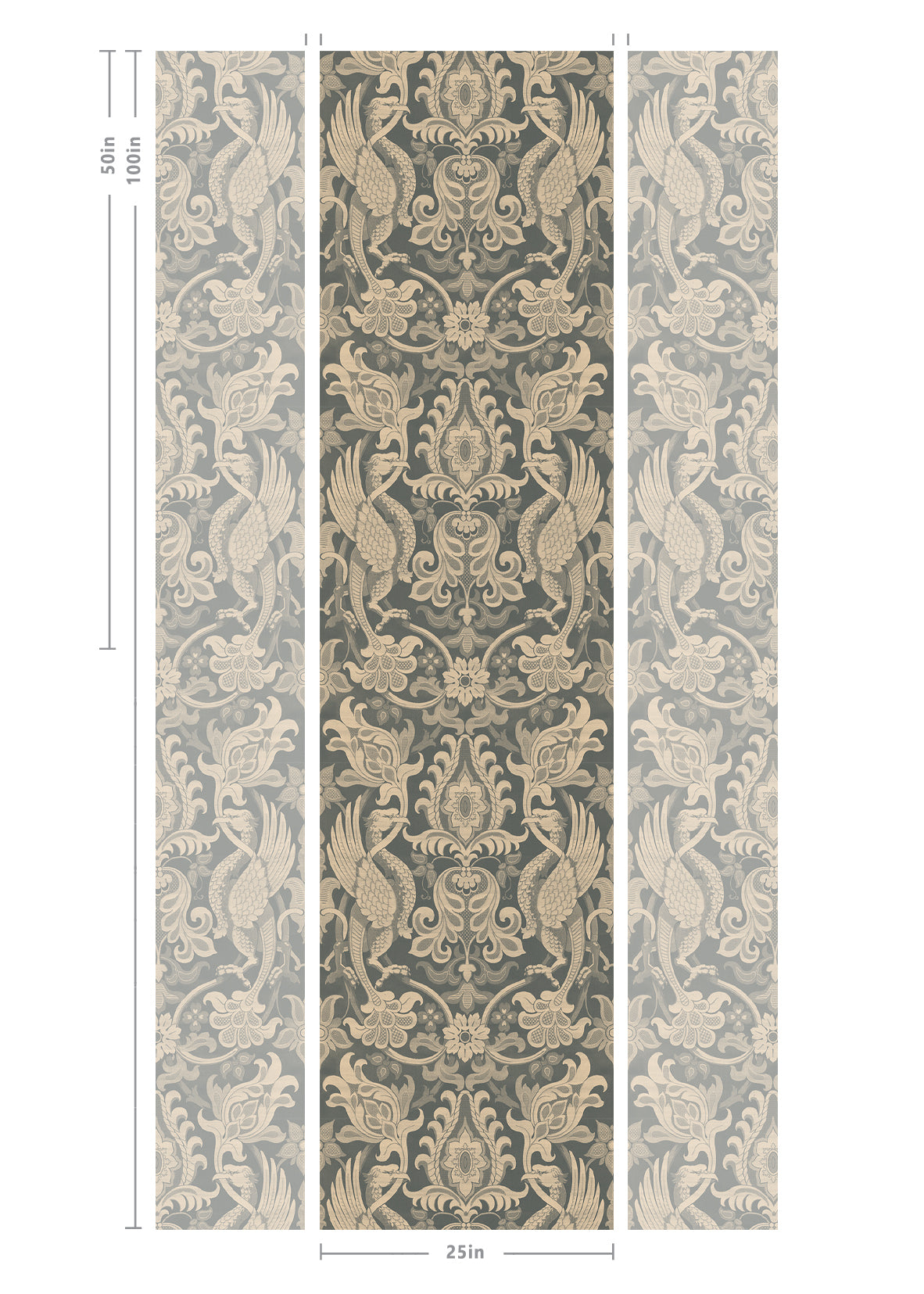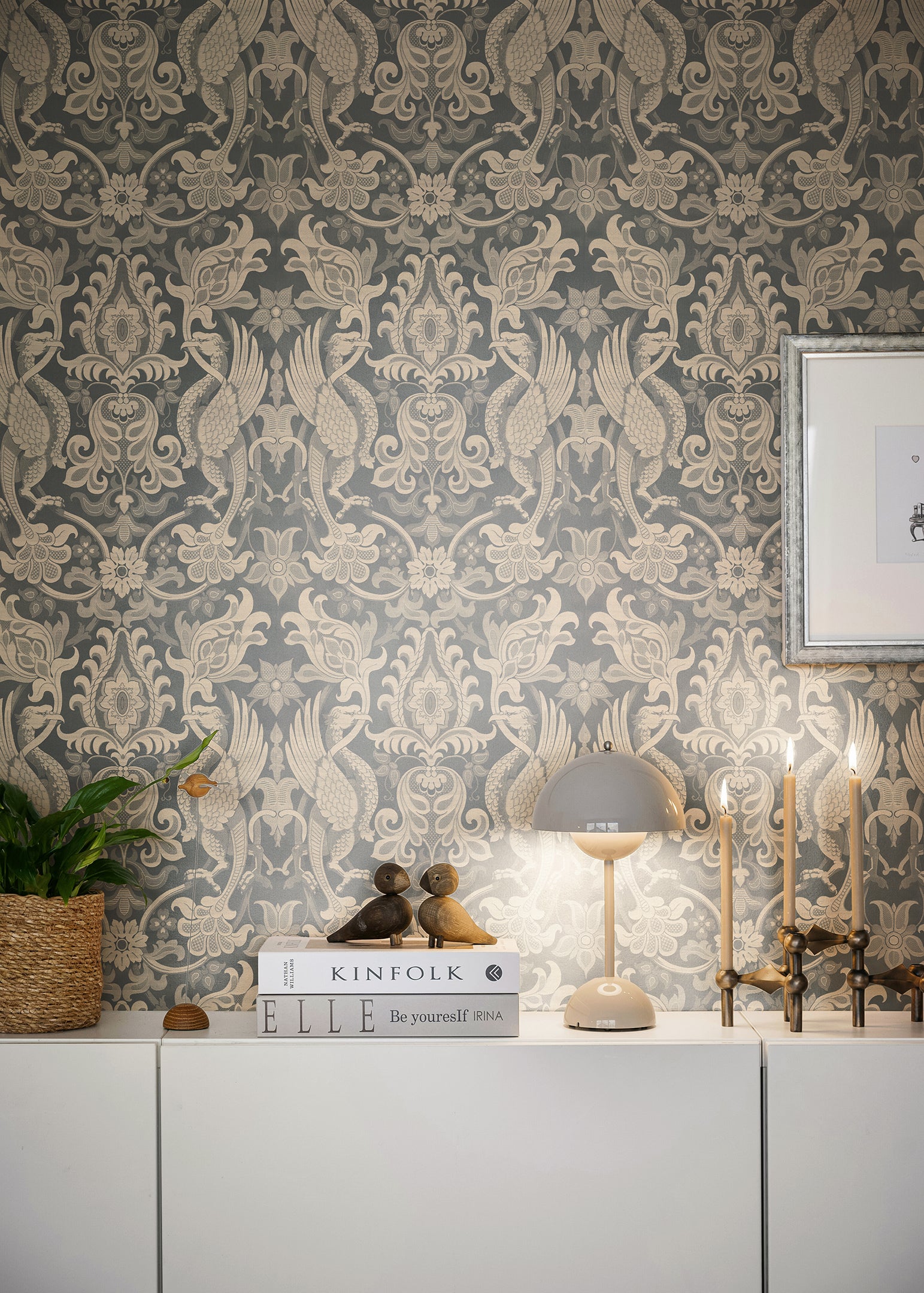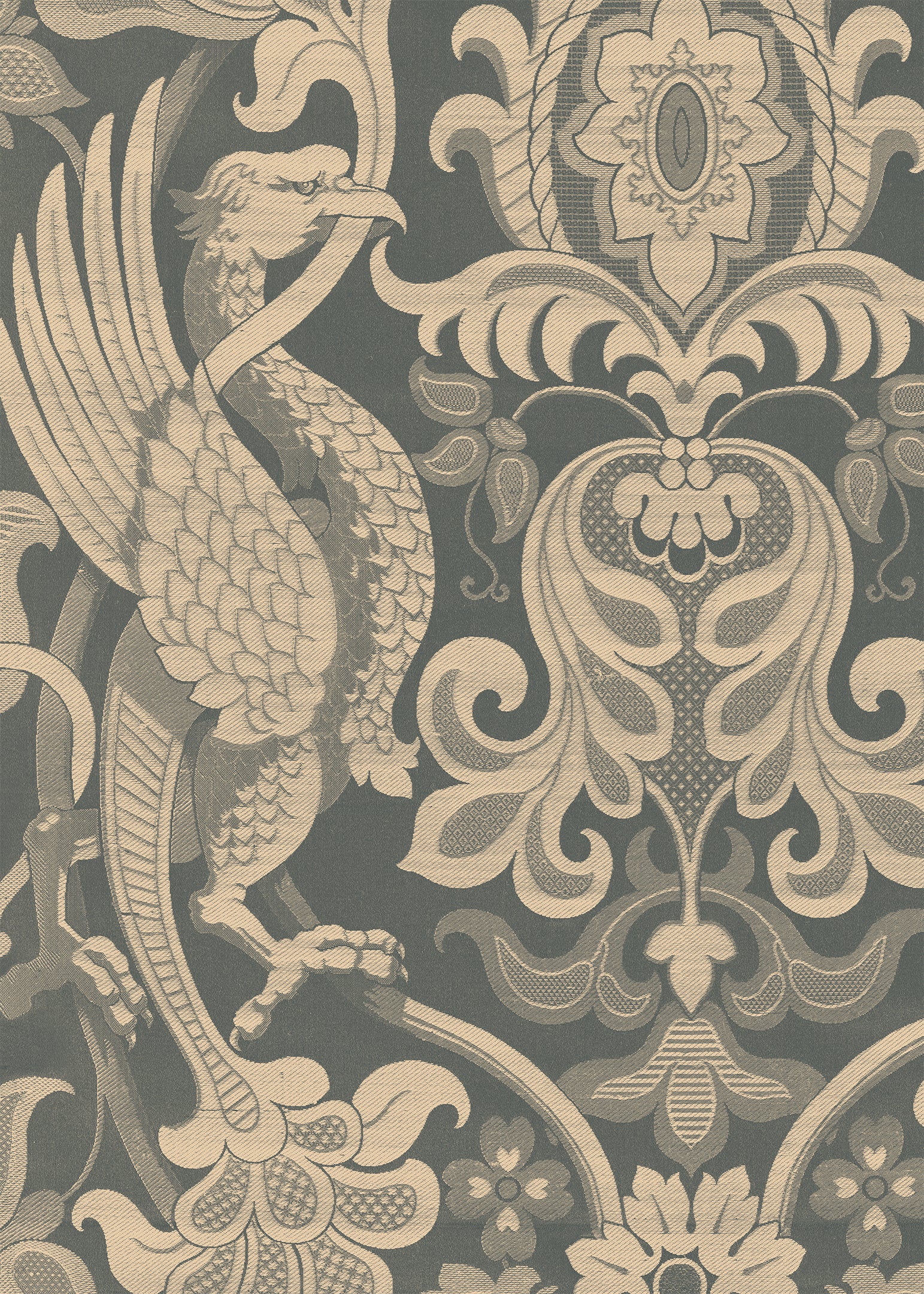A refined gray damask showcasing detailed mythical birds and classic ornamentation. Perfect for a subtle, sophisticated space.