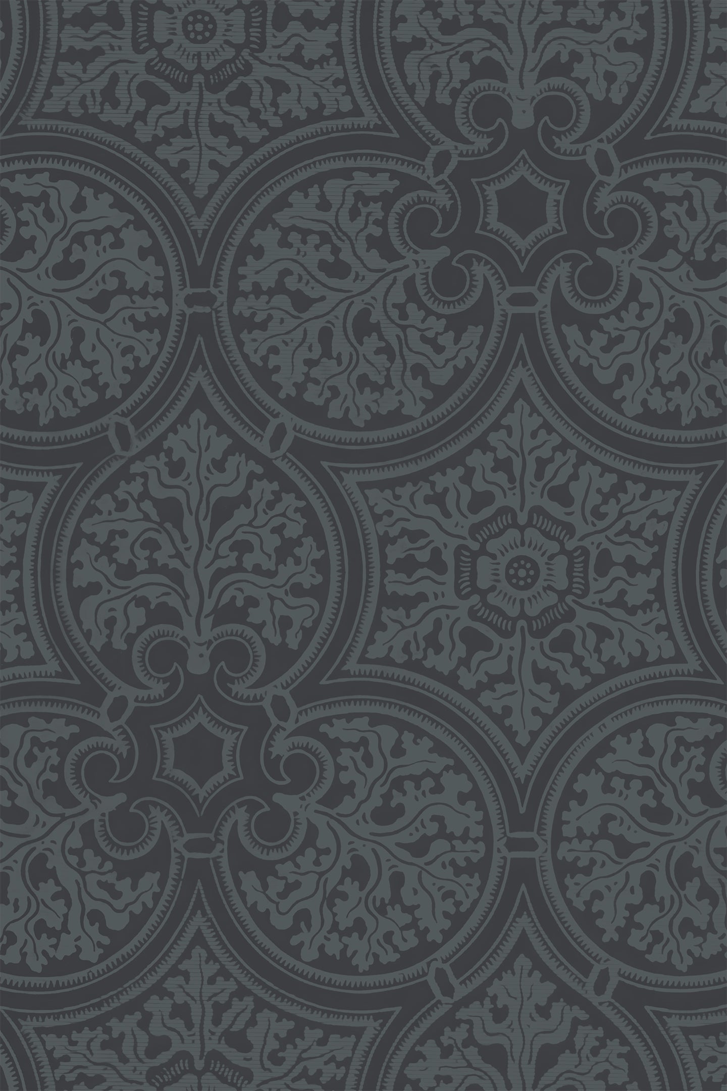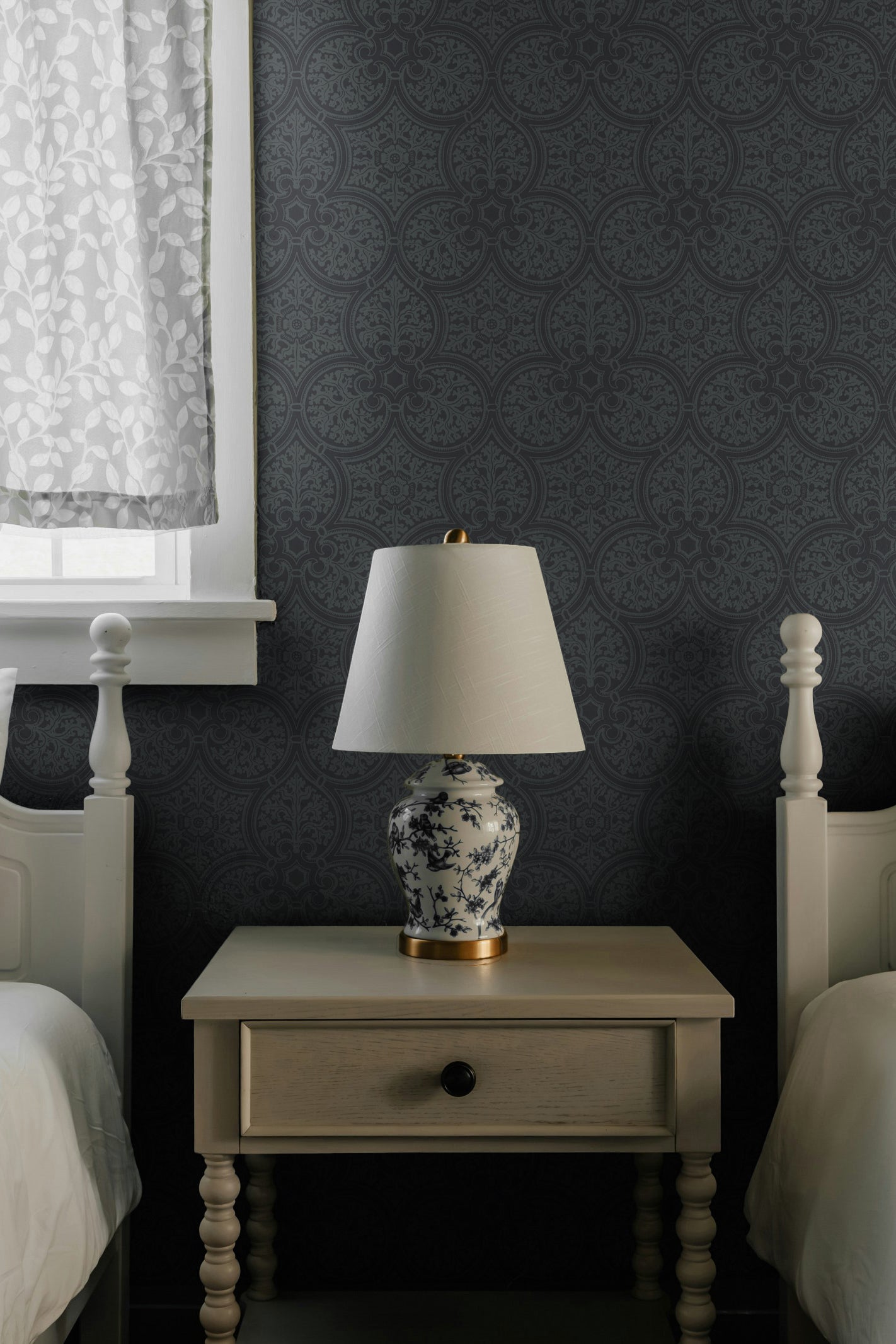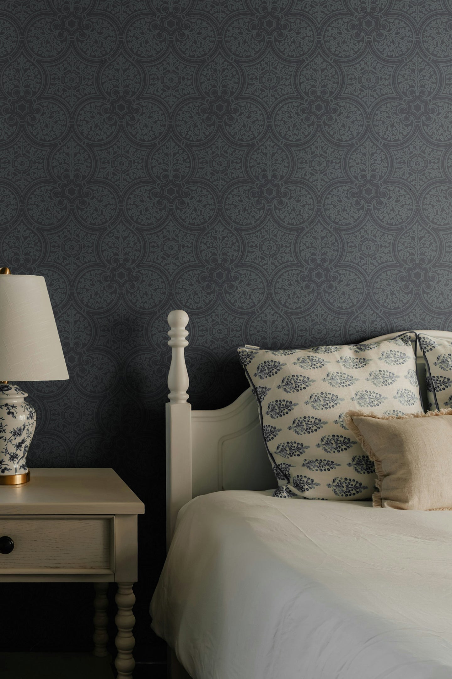A deep indigo base with muted blue detailing for a rich, moody atmosphere. This colorway offers a refined, modern twist on historic Baroque motifs, ideal for sophisticated offices, libraries, or dramatic feature walls. Custom wall sizes and pattern adjustments available.