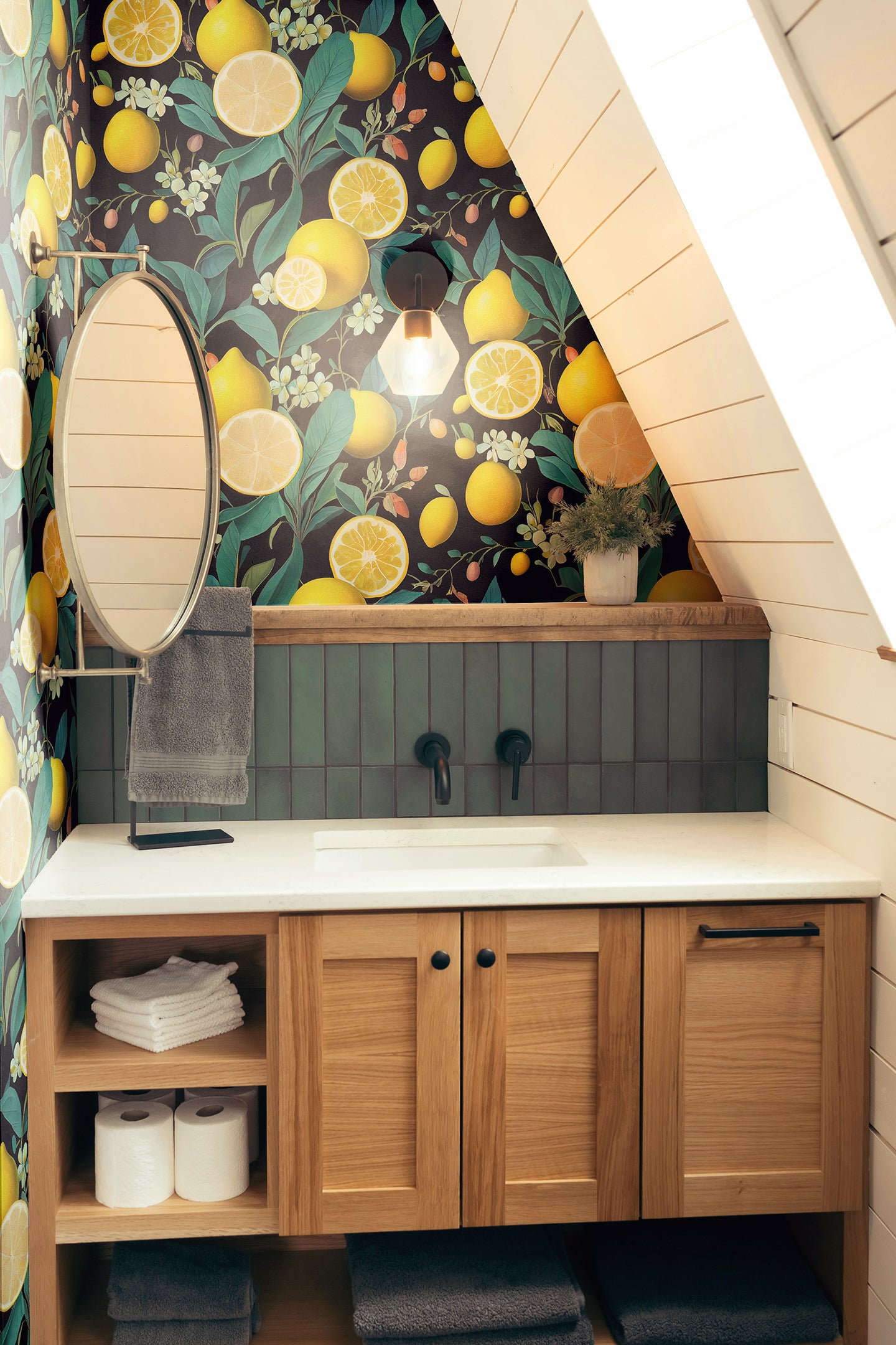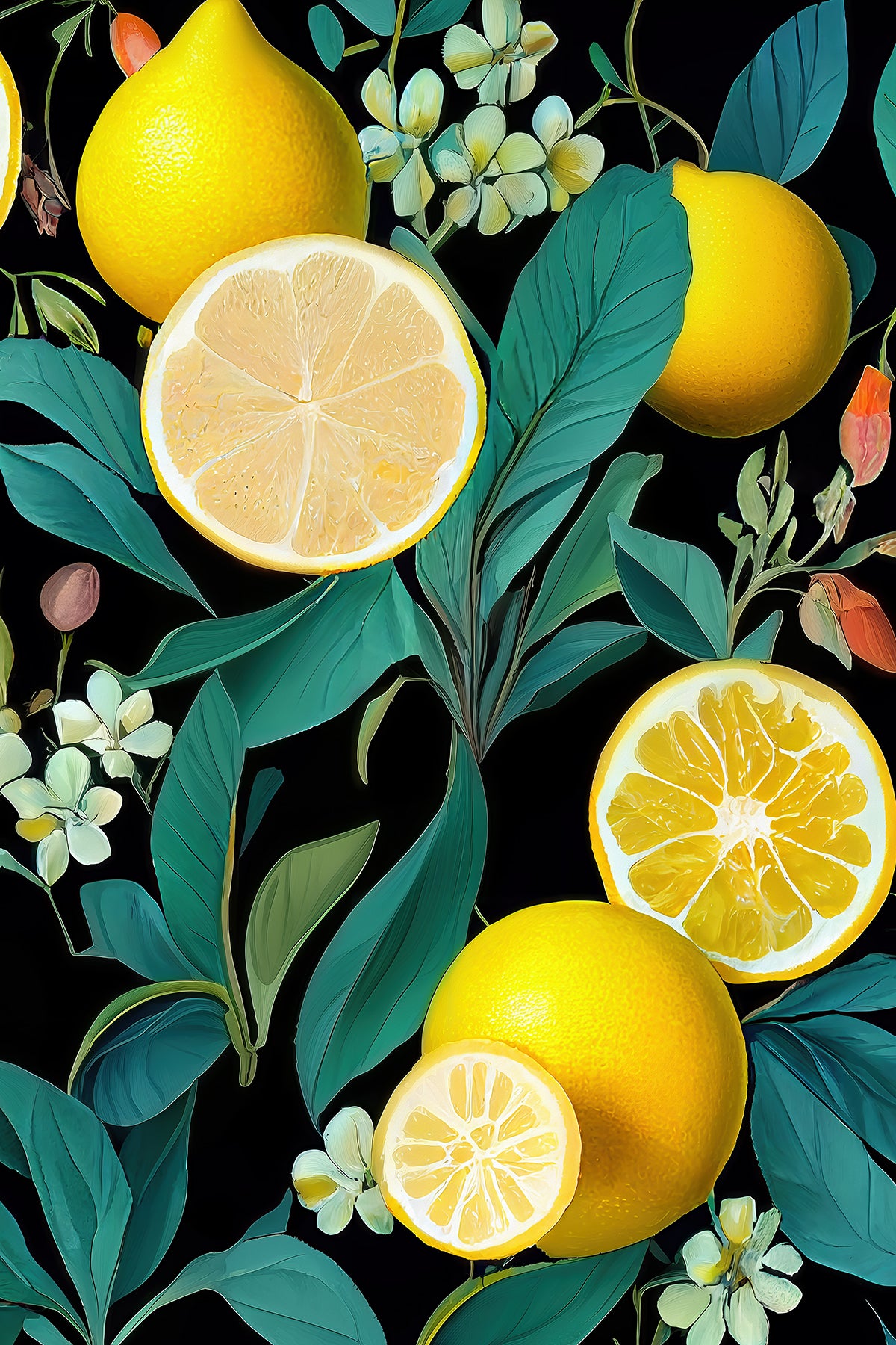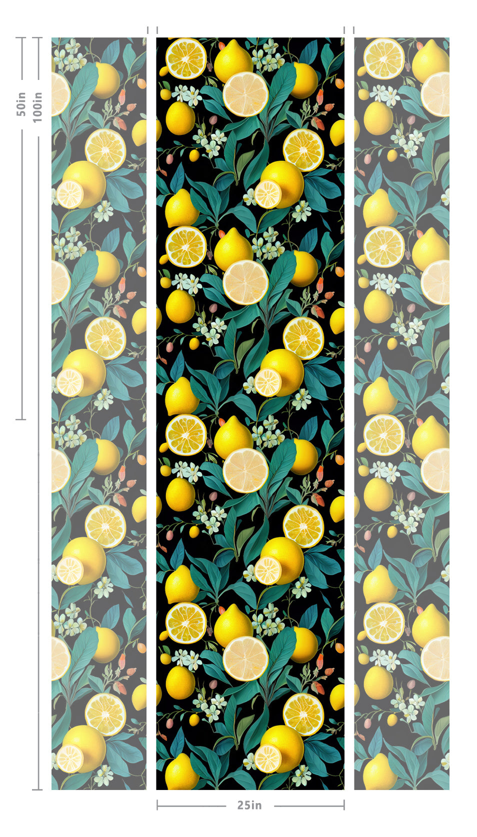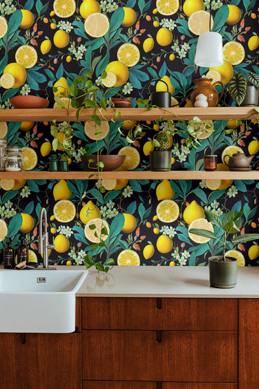"Citrus Garden”: Add a refreshing touch to your space with this vibrant and lively Lemon wallpaper. Featuring a repeating pattern of luscious citrus fruits and lush green leaves, our custom size options allow you to transform any wall into a beautiful garden oasis.