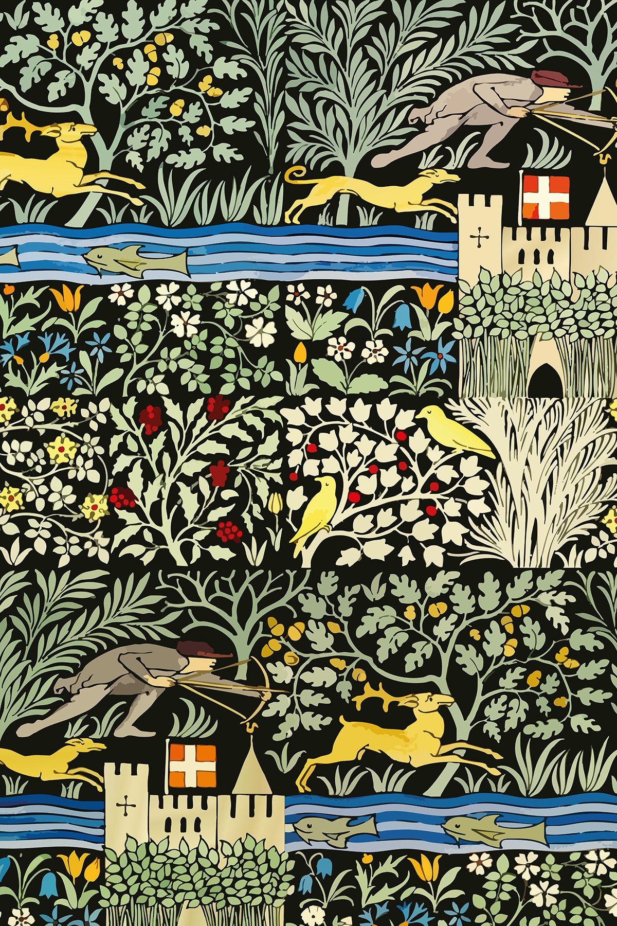 Inspired by the work of C.F.A. Voysey (1857–1941), a leading figure of the Arts & Crafts movement, this wallpaper reimagines his classic Huntsman design in a striking vector style. A dramatic black background makes the golden medieval motifs pop — ideal for bold, enchanted spaces with a touch of fantasy.