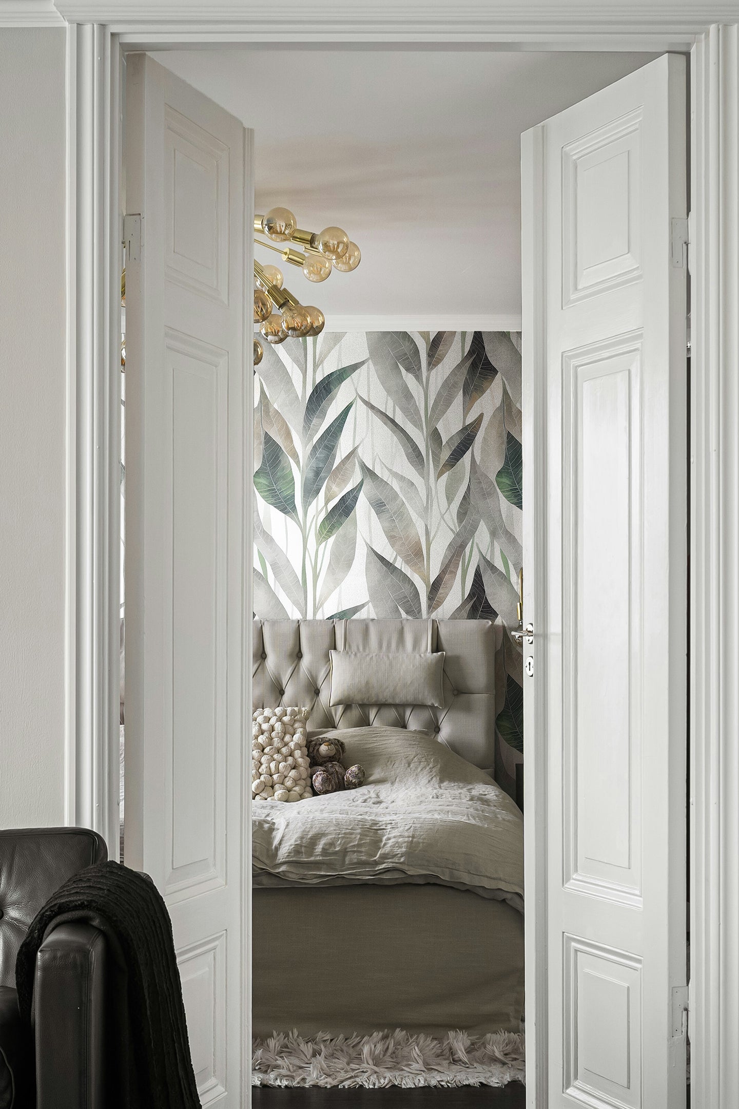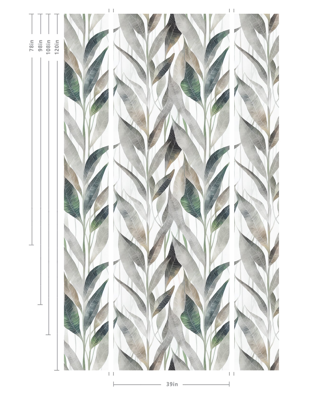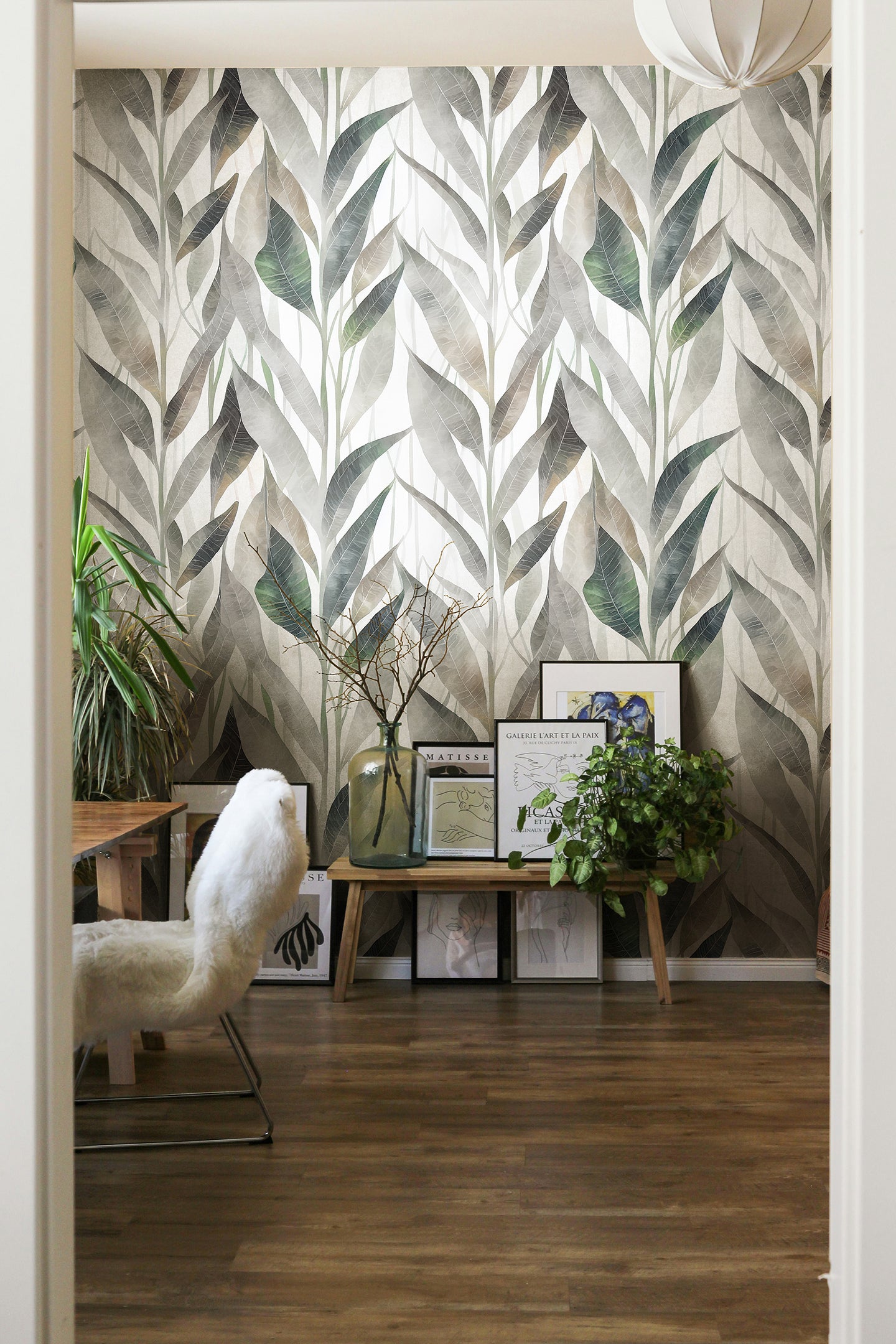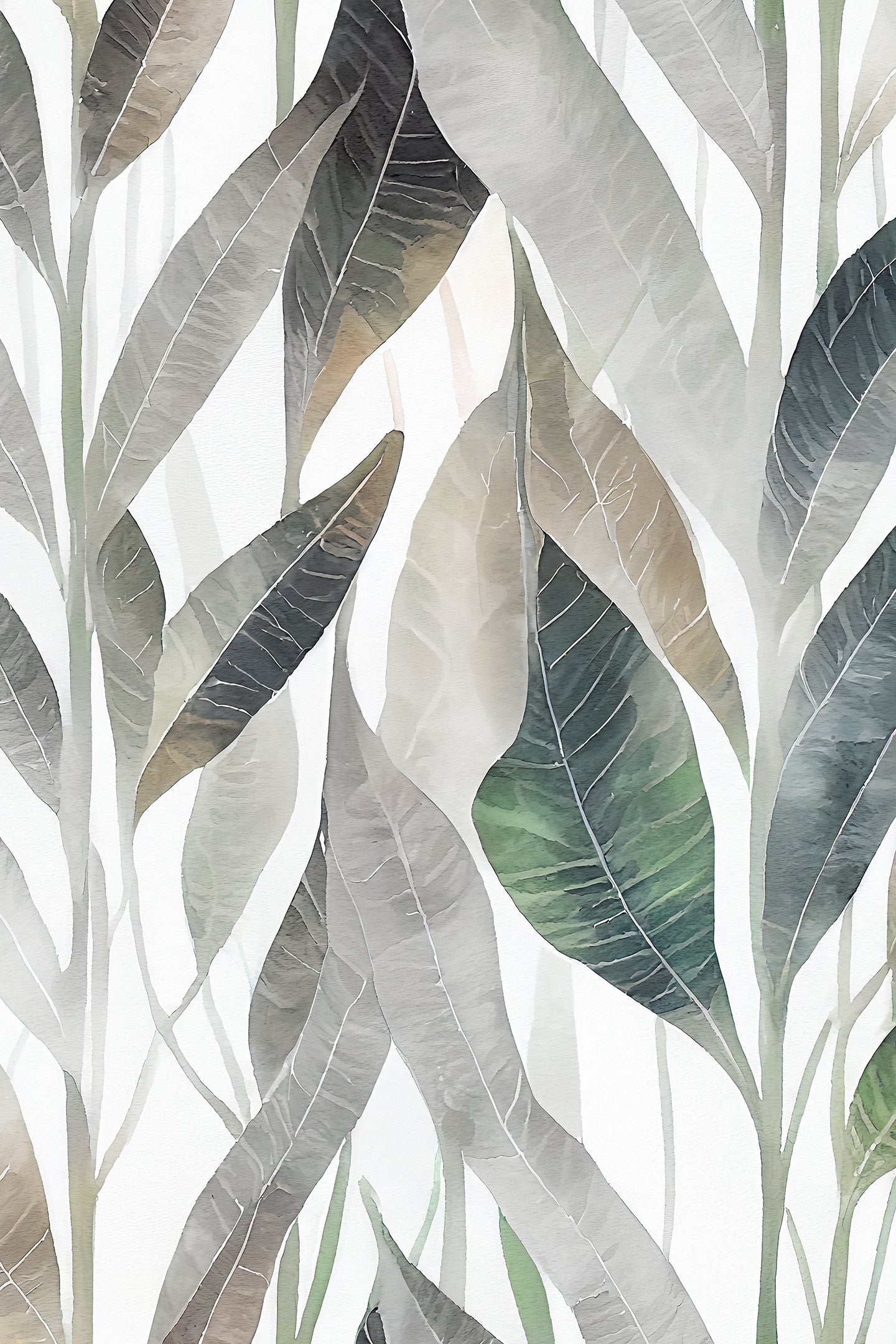 Rising Green Wallpaper brings a calm, organic elegance to any space with its tall watercolor leaves in layered shades of green, taupe, and grey. The soft vertical flow adds height and tranquility, making it perfect for living rooms, offices, and serene modern interiors.