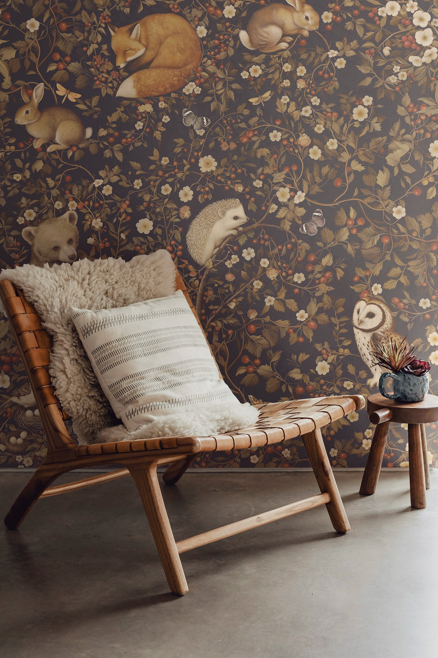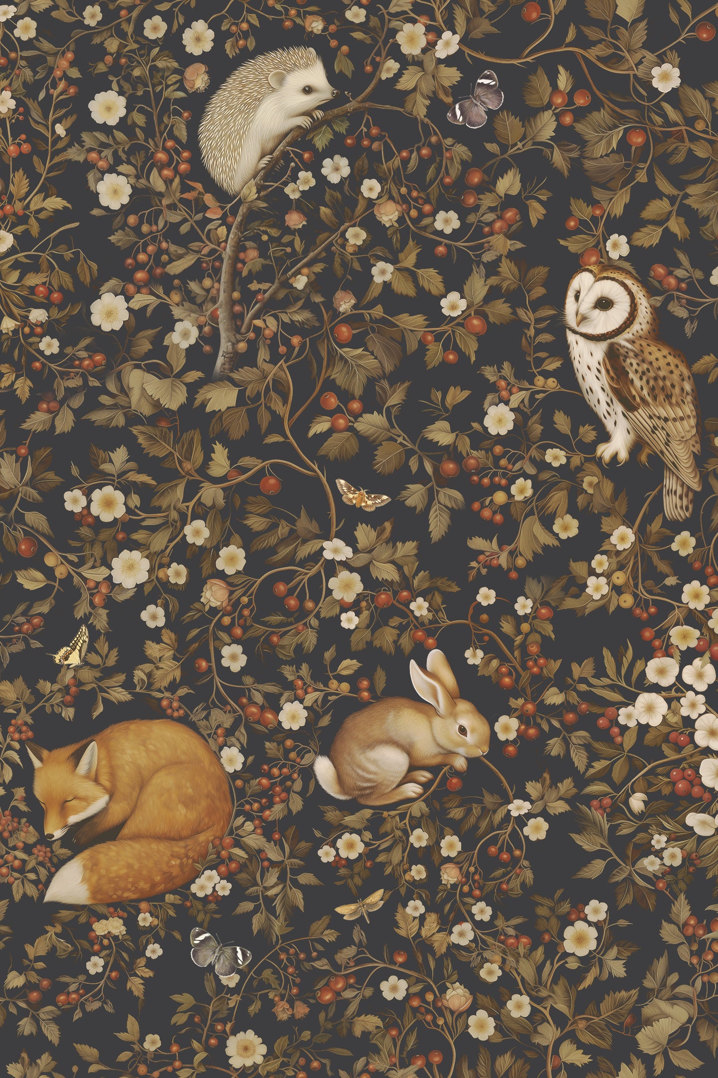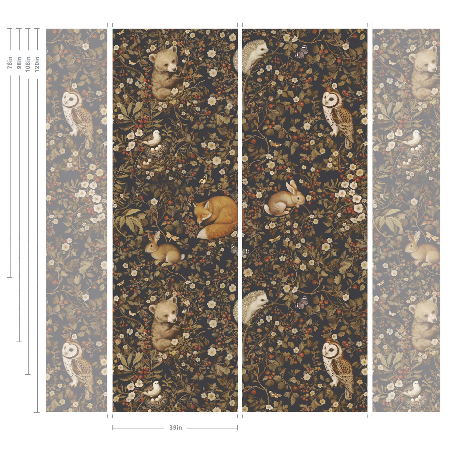 Step into an enchanted woodland at dusk, where foxes, owls, and rabbits come to life under a starry canopy. This deep charcoal backdrop brings timeless charm and quiet elegance to any space. Custom wall sizes and pattern adjustments available.