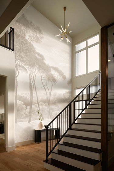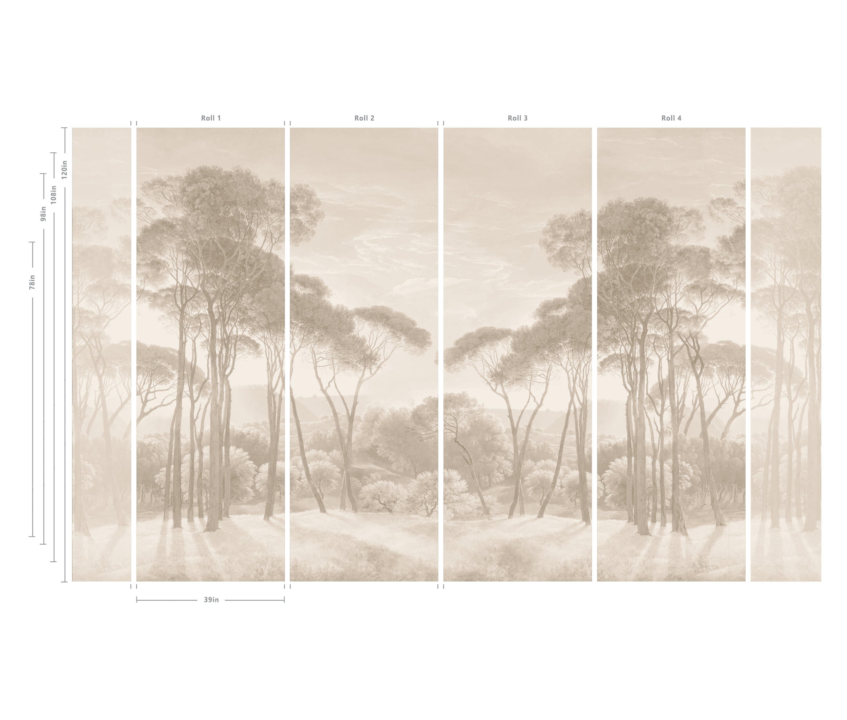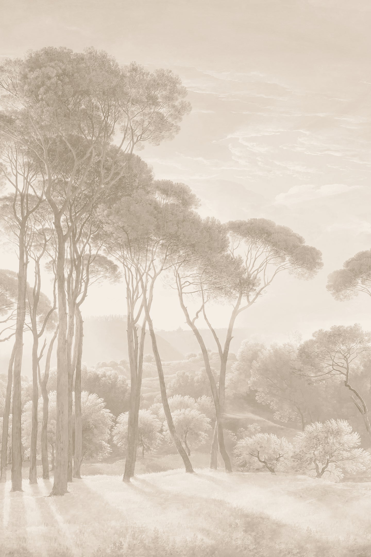 A warm, light-infused interpretation that enhances the fresco-like texture and aged character of the scene. Antique Pine Grove is a vintage-inspired mural featuring tall windswept pines, rolling meadows, and soft, painterly light.